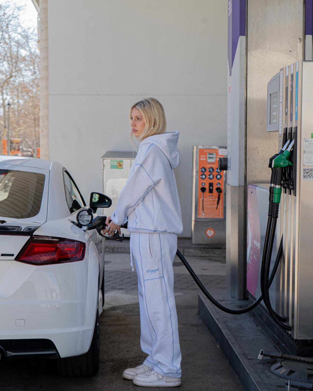 Sudadera oversized en gris jaspeado con pespuntes en baby blue a contraste. Esta obra maestra muestra nuestro 'Coast Icon' bordado en baby blue en el pecho. La prenda minimalista perfecta para completar tu armario.